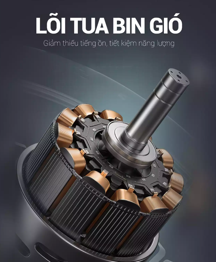 Lõi tuabin gió giúp giảm thiểu ma sát và tiếng ồn, đảm bảo quạt hoạt động êm ái, không gây ảnh hưởng đến sinh hoạt hàng ngày. Lõi tuabin giúp tối ưu hóa luồng gió, cung cấp luồng gió mạnh mẽ nhưng vẫn tiết kiệm năng lượng.